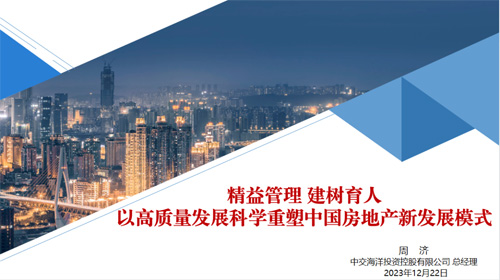 中交海南區域總部執行總經理、中交海投總經理、全聯房地產商會全裝修產業分會新任常務副會長周濟先生在線上發表了《精益管理,建樹育人;高質量發展科學重塑中國房地產新發展模式》的演講,他表示房地產行業發展宏觀層面的問題是經濟、社會和政治制度的問題、中觀層面是產業經濟與城市建設的問題、微觀層面是企業經濟活動與百姓生活的問題。周濟先生認為房地產是庇護人、養育人、愉悅人、禮遇人、教化人的“場所”。房地產不僅是造好房子,也不僅是營好生活及造好城市,房地產更是在“建樹育人”;所以未來房地產行業造房必先“造人”、造房更要“建企”。