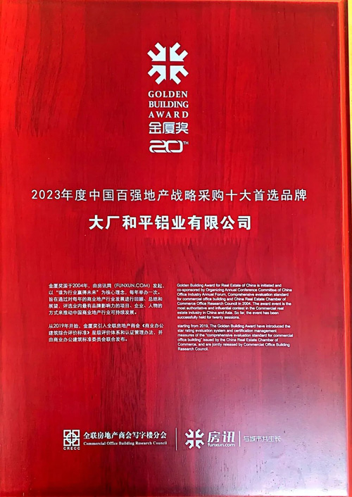 和平鋁業參加本次年會,并憑借高品質的產品和高標準的服務,榮獲「中國地產金廈獎——中國百強地產戰略采購十大首選品牌」榮譽。