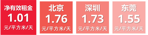 市場(chǎng)平均租金為人民幣1.01元/平方米/天。北京、深圳和東莞的凈有效租金排名前三,其中東莞以1.55元/平方米/天第一次進(jìn)入前三,上海以1.54元/平方米/天排名第四,這四個(gè)城市租金顯著高于其他城市。