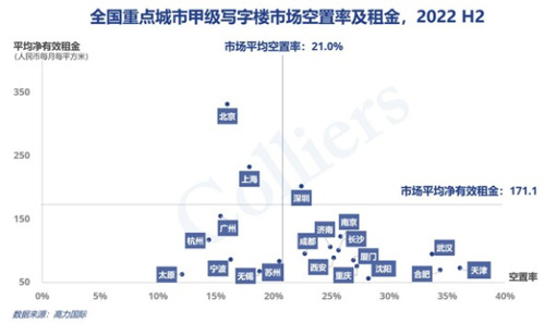 圖:全國重點城市甲級寫字樓市場空置率及租金