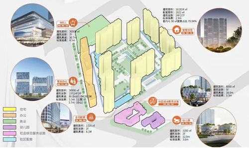 本項目包含業態種類豐富,合理的建筑布局有利于激發社區活力,形成多元互動。項目將四合院、胡同坊巷的北京古都印記,以設計的手法演繹置入,承古啟新。總圖合理分區,呈組團布局,形成住宅組團、商業辦公組團,以及幼教服務組團。公服設施放置于西側,沿五環形成連續城市界面,塑造城市公共界面形象及天際線。