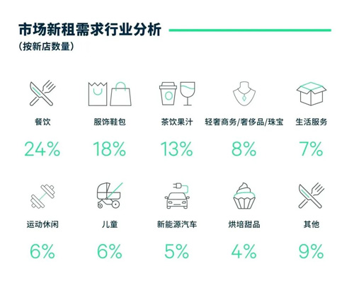 防疫政策解除對消費場所的人流限制后,隨著商場復(fù)業(yè)、客源復(fù)流,北京零售物業(yè)市場整體租賃需求初見復(fù)蘇跡象,并主要體現(xiàn)在餐飲業(yè)態(tài)上,餐飲以24%的新增店鋪比例超過其他業(yè)態(tài)成為關(guān)鍵需求引擎。地方口味特性較強(qiáng)的多元化餐飲品牌首店多有落地在核心及次級商圈(如韓式烤肉、日式燒肉、歐式西餐及小吃快餐等)。零售業(yè)態(tài)雖回暖態(tài)勢較慢,但其中奢侈品、黃金珠寶、高化、輕奢等高端消費品類持續(xù)在改造項目及高奢定位項目中優(yōu)化升級或新增鋪面(如Bottega Veneta、Chloe、Lola Rose、老廟黃金、六福珠寶等)。教培及娛樂等兒童體驗類業(yè)態(tài)反彈表現(xiàn)較佳,重新開業(yè)或新增鋪面在人口密度較大、生活屬性較強(qiáng)的次級商圈項目上多有發(fā)生,例如金源新燕莎·MALL、朝陽合生匯、藍(lán)色港灣等。Jordan、DESCENTE、波司登、The North Face等戶外運動品牌拓店節(jié)奏依舊穩(wěn)健?Х炔栾嫞ㄈ缌掷铩な执驒幟什、奈雪的茶、Manner)及烘焙甜品(如Don Nino、茉酸奶、蘭熊鮮奶)等年輕化、高頻率、低價位的網(wǎng)紅大眾品牌持續(xù)布局。