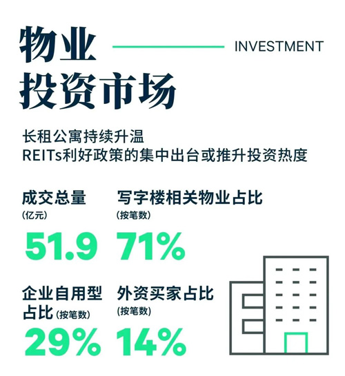 盡管只有兩宗交易進(jìn)賬,地產(chǎn)基金仍貢獻(xiàn)了57%的交易額。其中凱德投資的單一人民幣基金CCOP以28.1億元的交易額購入東四環(huán)CBD商圈的綜合體項目蘇寧生活廣場,成為季內(nèi)單筆金額最高的成交,項目經(jīng)過對商業(yè)部分的改造,辦公面積將增加至5.5萬平方米。該宗成交也反映了外資地產(chǎn)基金設(shè)立人民幣專項基金,憑借其主動管理能力和經(jīng)驗,聯(lián)合國內(nèi)資本,持續(xù)加碼商業(yè)地產(chǎn)。險資對于不動產(chǎn)資產(chǎn)配置的關(guān)注亦是日漸凸顯,季內(nèi)錄得平安人壽收購弘毅投資位于北京和上海的產(chǎn)業(yè)園資產(chǎn)包,其中包含北京海淀一棟寫字樓和一個園區(qū)辦公項目。整體看,租賃市場表現(xiàn)尚未回暖,使得大部分投資者對市場依舊持觀望態(tài)度。自用買家繼續(xù)鎖定非核心區(qū)域?qū)懽謽腔蛏虅?wù)園區(qū)物業(yè),本季度北清路子市場的萬科翠湖國際和石景山區(qū)域的華遠(yuǎn)中心寫字樓錄得企業(yè)購入自用,面積體量均在1.5萬平方米以下。從資產(chǎn)類別看,在REITs不斷擴(kuò)容以及租賃市場表現(xiàn)日益活躍的推動下,以長租公寓為代表的新基建資產(chǎn)交易數(shù)量明顯增加,豐臺區(qū)域連續(xù)第二個季度錄得以長租公寓為目的用途的項目交易。