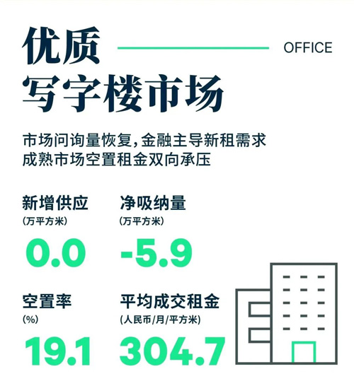 得益于國企和地緣性租戶的升級搬遷和擴(kuò)租,新興子市場季度凈吸納量表現(xiàn)最佳,共計錄得6.1萬平方米。但企業(yè)以成本為導(dǎo)向的搬遷、業(yè)務(wù)調(diào)整和整合至自用樓宇等活動所造成的多宗大面積騰退交易使得成熟子市場,如CBD、中關(guān)村、望京和奧體的凈吸納量均錄得負(fù)值,從而導(dǎo)致全市季度凈吸納量亦轉(zhuǎn)為負(fù)值,錄得-5.9萬平方米。整體空置環(huán)比攀升至19.1%:中關(guān)村空置率增幅最大,環(huán)比上漲3.8個百分點至15.7%;望京和奧體空置率也已超全市平均水平,上升至20%以上。平均成交租金面價仍在下行通道,同樣本比環(huán)比下降0.5%至每月每平方米304.7元。除新興區(qū)域租金保持平穩(wěn)外,其余子市場均錄得不同程度降幅,其中中關(guān)村和望京跌幅靠前。