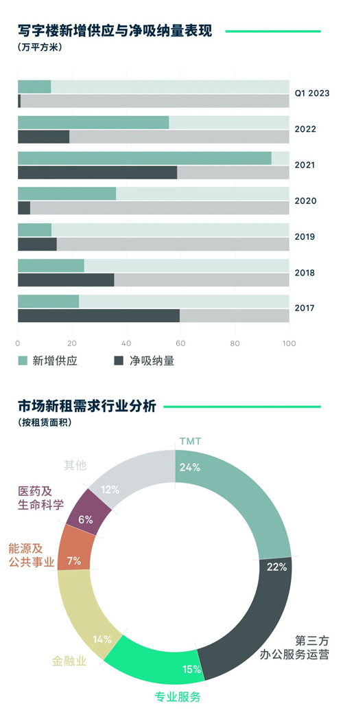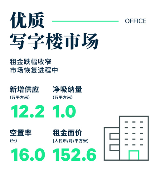 春節(jié)后,市場(chǎng)問詢量、帶看量較年前大幅增加,商務(wù)活動(dòng)活躍度提升,但轉(zhuǎn)化為租賃成交仍需時(shí)日。目前寫字樓用戶的動(dòng)態(tài)以續(xù)租或整合搬遷為主,降低成本仍然是企業(yè)考慮的重要因素,如某游戲公司從地標(biāo)項(xiàng)目搬遷到同區(qū)的乙級(jí)寫字樓,某大型電信通訊類企業(yè)從甲級(jí)寫字樓退租、回到自用物業(yè)。季內(nèi)凈吸納量為1.0萬平方米,環(huán)比減少90%。樓宇繼續(xù)采用租金優(yōu)惠來促進(jìn)去化,全市租金面價(jià)環(huán)比下降0.5%,至每月每平方米152.6元,租金跌幅環(huán)比收窄1.3個(gè)百分點(diǎn)。