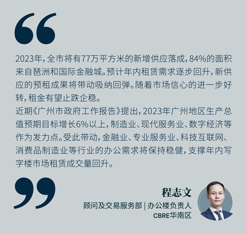 2023年,廣州預(yù)計(jì)將有32萬平方米的優(yōu)質(zhì)零售物業(yè)投入市場(chǎng),包括珠江新城和北京路的小體量新項(xiàng)目,以及大悅城在廣州的首個(gè)項(xiàng)目。供應(yīng)量將較2022年減少4%,在需求回暖的預(yù)期下,空置率有望小幅下調(diào),整體租金將觸底,核心商圈優(yōu)質(zhì)物業(yè)有望獲得租金反彈。
