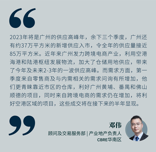 2023年第一季度,廣州共錄得47宗、共247萬平方米的工業(yè)土地出讓,其中增城區(qū)單季出讓土地面積最多,占比56%,其次為南沙區(qū)(15%)。另外,本季錄得10宗含有倉儲(chǔ)用途的土地,總用地面積達(dá)到99萬平方米。其中包括希音獲得的位于增城區(qū)中新鎮(zhèn)49萬平方米的倉儲(chǔ)用地。而另一宗同位于中新鎮(zhèn)的工業(yè)兼容倉儲(chǔ)用地,規(guī)劃建筑面積則高達(dá)101萬平方米。另外,小鵬汽車亦于本季競(jìng)得位于黃埔區(qū)中新知識(shí)城一幅工業(yè)用地,規(guī)劃建筑面積14萬平方米。
