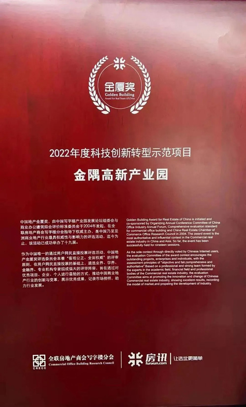 在中國寫字樓產業園發展論壇第十九屆年會上,2022年度中國地產金廈獎重磅揭曉,并舉辦了盛大的頒獎典禮。