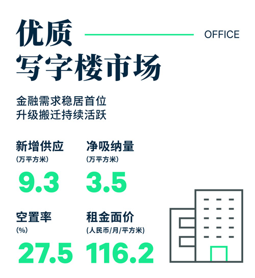 2023年第一季度,南京寫字樓市場錄得一個新項目交付,位于河西板塊的金鷹世界B座,作為垂直產業園區,該項目立足于數字經濟、智能制造、生命健康等行業辦公需求打造未來產業基地。隨著疫情影響逐漸消散,企業經營預期穩步向好,市場活躍度呈現回暖態勢,季內租戶問詢與帶看均有大幅提升,帶動租賃需求走出陰霾,凈吸納量達3.5萬平方米,環比增加69.8%,而受到大體量新增供應入市影響,全市空置率環比上漲1.0個百分點至27.5%。