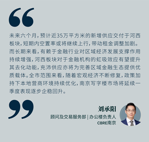 需求方面,金融業憑借占比近半的租賃需求穩居首位。季內河西板塊金融行業集聚優勢突出,銀行、保險與證券等傳統金融機構均有大面積搬遷需求落位,推動板塊內部金融生態不斷完善;與此同時,諸如汽車金融、普惠金融等新興金融業態于各個板塊內標桿項目錄得成交,為南京實現“一核兩翼、多點聯動”的金融中心建設打下堅實基礎。另外,能源轉型的進程提速,驅動以新能源產業為引領的能源及公共事業的租賃需求位居第二,升級搬遷與擴租需求于多個板塊持續放量。后疫情時代,本土商業空間運營品牌依托逐漸提高的靈活辦公接納程度迎來發展新機遇,聚焦新街口核心區位積極布局。房地產建筑中各細分行業租賃需求釋放積極信號,醫美、培訓等多業態消費服務韌性發展,均于新街口及河西有升級擴張之勢。