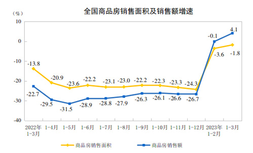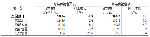 1—3月份,商品房銷售面積29946萬平方米,同比下降1.8%,其中住宅銷售面積增長1.4%。商品房銷售額30545億元,增長4.1%,其中住宅銷售額增長7.1%。