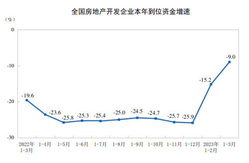 1—3月份,房地產開發企業到位資金34708億元,同比下降9.0%。其中,國內貸款4995億元,下降9.6%;利用外資8億元,下降22.7%;自籌資金10171億元,下降17.9%;定金及預收款11909億元,下降2.8%;個人按揭貸款6188億元,下降2.9%。
