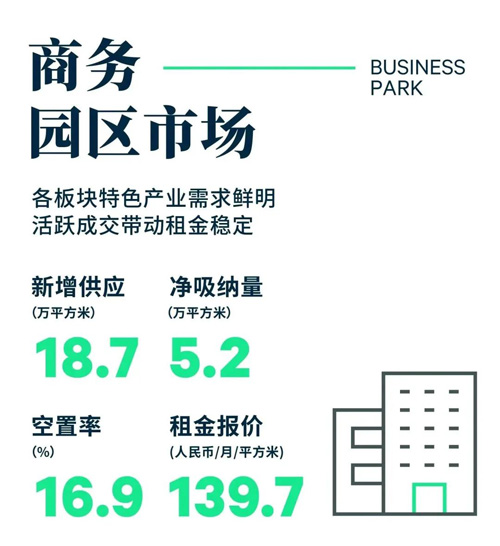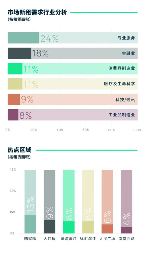 從需求來看,專業服務業(律師事務所、企業咨詢和數據服務)、金融業(其他金融服務、證券、基金)與消費品制造業是主要的需求驅動力。從區域來看,前灘和徐匯濱江等濱江商務區凈吸納量居前。至此,全市空置率環比微升0.5百分點至18.0%。