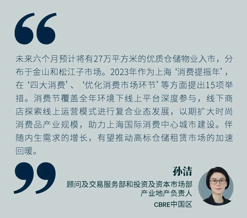 第三方物流仍為需求首位,其中消費需求成交占據主力,消費市場活力恢復帶動了倉儲去化。大型租賃成交包括兩家奢侈品品牌的配送租賃落地于閔行和松江,一家知名三方物流企業在金山擴租用于其家用電器業務的供應鏈布局。食品飲料需求亦有提升,本季度錄得傳統糕點品牌在金山一萬平方米的新租。然而受年初出口走弱的影響,空置率長期處于低位的虹橋和浦東機場子市場出現空置水平上升的情況,均有3-4萬平方米的退租。