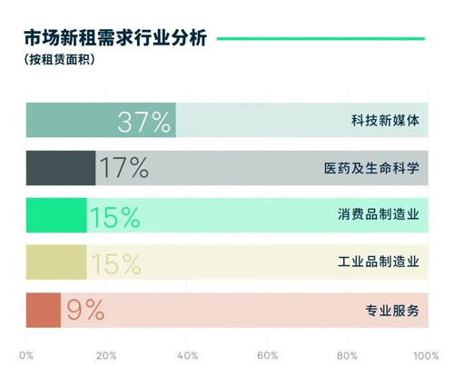 季度成交活動呈樂觀活躍態勢,行業需求穩步釋放,除自用及續租外,約七成成交來自于新設,另三成來自擴張。TMT行業以37%的占比保持租賃需求首位,其中華為繼續擴租推動電信通訊子行業持續火熱;電商類企業在漕河涇積極新設;另錄得多領域軟件開發和科技互聯網類新興企業成交。搶占數字經濟發展新機遇,擁有成熟盈利模式并依賴人才資源的TMT企業仍是市場主力租賃需求。生物醫藥以17%的占比位列第二,并集中在以張江為核心,聯動外高橋、金橋及浦江特色園區的區域;就細分賽道而言,創新藥及研發外包持續火熱。后疫情時代,醫藥行業投資信心修復,創新能力成為主要發展引擎,發掘更多藍海市場。得益于蔚來汽車持續擴租及聯合汽車電子擴產新租活動,消費品制造業季度需求達15%。以新能源汽車為代表的汽車市場有望在2023年繼續呈現穩中向好態勢,拉動產業鏈相關企業煥發租賃需求新動能。