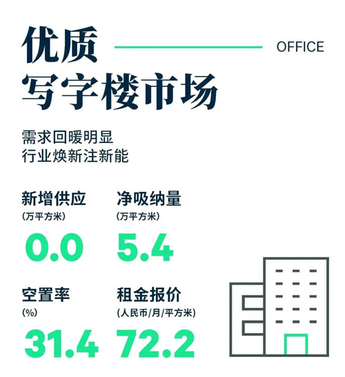 2023年第一季度,西安優質寫字樓市場未錄得新增供應入市,受個別乙級樓宇傾向整租及部分業主資金問題仍未緩解影響,年內新增供應將集中在下半年入市。優質寫字樓市場總量仍保持在692.3萬平方米。其中甲級辦公樓體量為174萬平方米。寫字樓市場租賃情緒有所改善,市場需求明顯回暖。季內,西安寫字樓市場凈吸納量環比上升67%,至5.4萬平方米,較去年同期亦上升3%。市場空置率重回下行通道,下降0.8個百分點,至31.4%。租金方面,小業主的持續降租導致整體市場可比租金環比下降1.3%,甲級寫字樓租金雖仍處下行通道,但隨著帶看量,問詢量及成交的增加,更多業主態度有所轉變,故甲級寫字樓降幅收窄,環比微降0.3%。