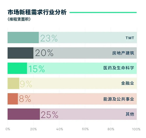 市場逐步回暖,行業煥活為寫字樓市場注入動能。本季度市場新增需求主要來自科技互聯網(23.2%)、房地產建筑(19.6%)與醫藥及生命科學(15.0%)。科技互聯網中以在線教育類平臺互聯網的新設立需求為主。教育行業在繼十八大報告中“鼓勵引導社會力量舉辦教育”及去年年底多條政策的相繼出臺迎來利好。季內,西安寫字樓市場錄得來自非盈利性質及在線職業、素質教育等線上教育機構近12,500平方米的新租需求。來自建筑工程類企業的辦公需求仍主導房地產建筑行業新增需求。其中,高新二期吸納了超過60%的新設立及升級需求。2023年作為“四個高新”跨越年實施“四個高新”重點項目598個,總投資10,930億元。建設規模的擴大使高新二期持續承接建筑工程類企業的升級搬遷需求。同時,作為“雙中心”主要承載區,隨著未來“未來之瞳”及“絲路科學城”等重點項目建設的提速,此類租戶的升級擴租趨勢將有所延續。季內醫藥及生命科學行業在本地藥企的換租、升級需求拉動下放量明顯,占比有所攀升。