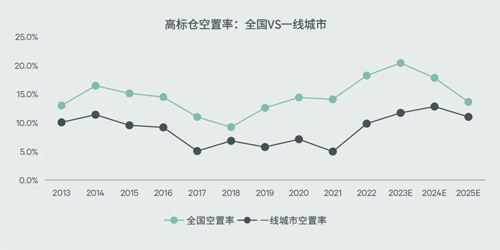 受此推動,CBRE預計未來三年一線城市的高標倉凈吸納量有望達到年均127萬平方米左右,較此前三年的水平大幅增長41%;整體空置率在2024年見頂后將迅速向10%的水平回落。