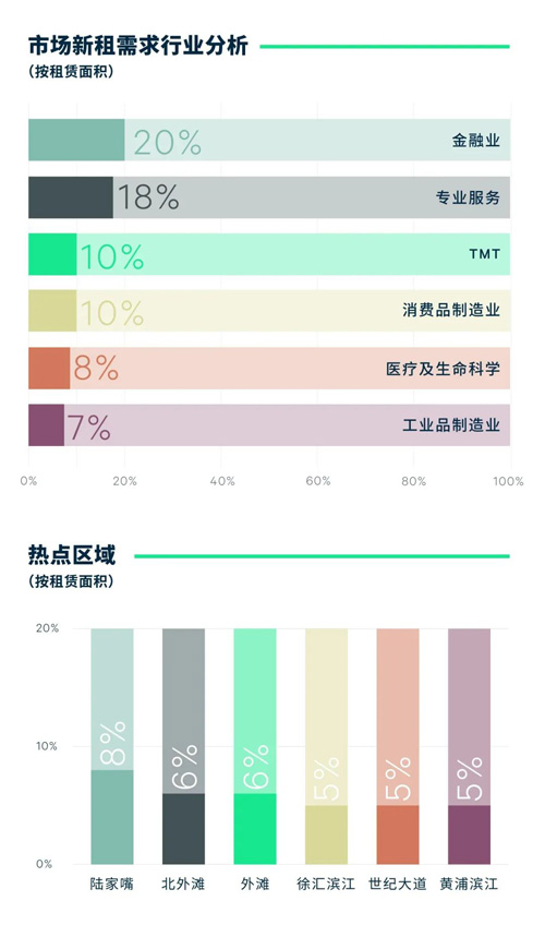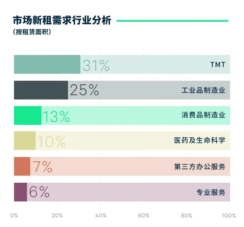 企業搬遷新租需求進一步釋放落地,市場成交活動呈現積極態勢。TMT行業以31%占比穩居需求首位,其中平臺互聯網子分類表現亮眼,錄得醫療信息、旅游、智慧零售及共享租車等多類型企業租賃活動;軟件系統開發類企業持續活躍,錄得人工智能、自動駕駛和娛樂體感等前沿領域企業成交。數字化滲透在各行業的應用度不斷提高,引領新的產業發展方向,推動TMT行業持續釋放動能。以芯片為主的工業品制造業以25%占比攀升至租賃需求的第二位,芯片國產化趨勢如火如荼,多家企業布局上海。充分體現作為三大先導產業之一,上海在集成電路領域持續深耕,形成頗具集群效應的產業高地。得益于新能源汽車和智能駕駛的發展,相關企業擴租新設活動推動消費品制造業以13%的需求占比位居第三。