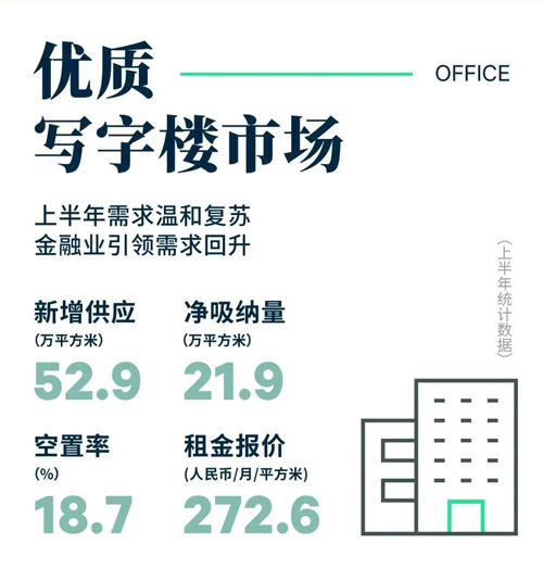 上半年凈吸納量為21.9萬平方米,較去年同期下調31.6%,其中第二季度凈吸納量180,491平方米,相較于第一季度有明顯回升,市場需求逐漸展現復蘇跡象。從區域來看,火車站及徐匯濱江區域凈吸納量居前。但全市由于新增供應量集中,推升全市空置率至18.7%,較去年年底上升1.2個百分點。