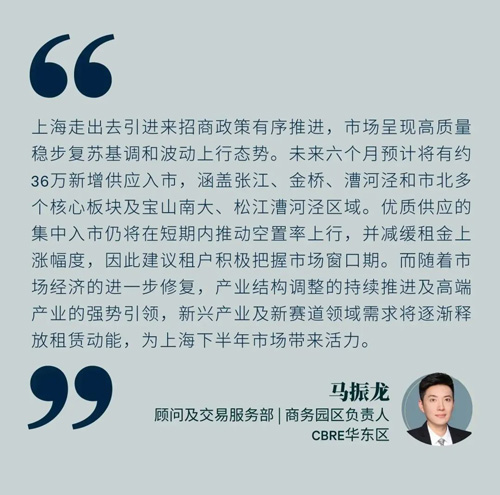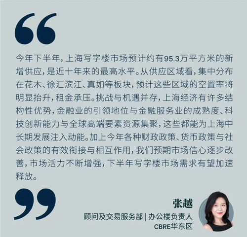 租金方面,上半年全市租金報價較去年年底下降1.1%至每月每平方米272.6元。上半年跌幅較為明顯的區域是真如與大寧,租金下跌主要受新增供應持續增加加劇市場競爭以及過往項目去化速度的影響,部分業主對市場預期轉弱,主動小幅下調租金,以期占據更多市場。