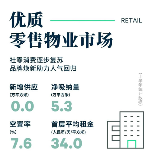 上半年上海零售物業市場未錄得新項目入市,存量升級項目新天地時尚II煥新回歸,引入眾多新潮首店,打造年輕潮流社交主場。上半年市場凈吸納量錄得5.3萬平方米,其中二季度單季錄得1.9萬平方米,全市空置率環比下降0.1個百分點,較去年年末下降0.4個百分點至7.6%。租金方面,得益于核心與次級商圈租金的陸續回暖,全市購物中心首層租金于年初止跌,二季度維持平穩走勢,報每天每平方米人民幣34.0元。