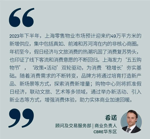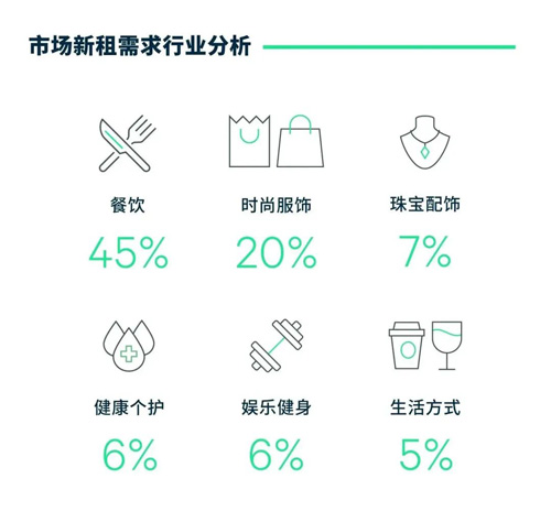 時尚服飾類需求占比20%,以潮流女裝、設計師品牌以及運動戶外類需求活躍。其中,lululemon亞太最大門店落地靜安嘉里中心,UNITED ARROWS國內首家快閃店登陸港匯恒隆廣場。珠寶配飾類需求占比7%,周大福薈館JEWELRIA以及六福珠寶等品牌多點布局,日本珠寶品牌STAR JEWELRY中國首店亮相港匯恒隆廣場。此外,德國連鎖超市品牌ALDI奧樂齊加速上海布局,上半年連擴多家門店。