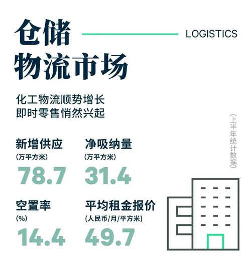 2023年上半年上海倉儲物流市場錄得7個新項目入市,累計供應達78.7萬平方米,創歷史新高,過半供應落入青浦子市場,其中二季度新增供應體量為25.2萬平方米。三方物流和電商的新興增長點持續為上海市場帶來新租需求。上半年凈吸納量共計31.4萬平方米,達7年內歷史最高水平,其中二季度凈吸納量錄得14.9萬平方米。