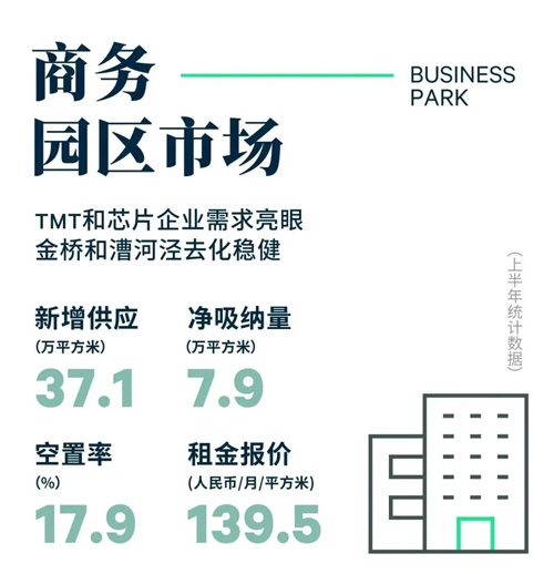 2023年上半年商務園區寫字樓市場新增供應共錄得五個項目,分別位于漕河涇、金橋、浦江及青浦,共計37.1萬平方米,同比回升47%。其中二季度新增供應18.4萬平方米,為金橋的金科園和青浦的趙巷科技綠洲B區N和趙巷科技綠洲C區。新增供應回暖,需求波動復蘇,上半年累計凈吸納量7.9萬,其中二季度凈吸納量2.7萬平方米。因此,上半年市場空置率累計上行2.1個百分點至17.9%。