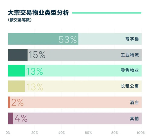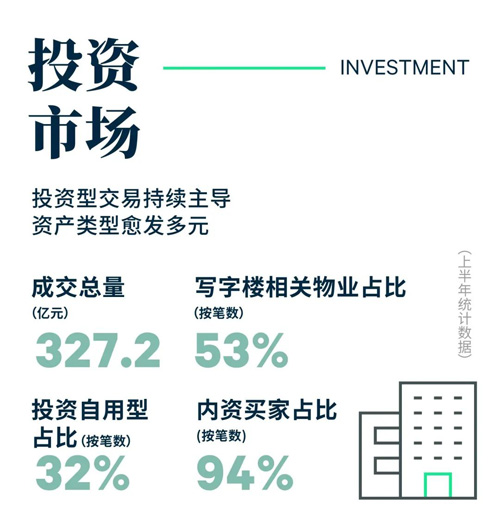 買家類型方面,企業仍為上半年市場交易金額占比最大的買家,除近期專業服務業、能源與科技公司相繼購置自用辦公物業外,企業以投資為目的布局地產板塊的情況屢見不鮮。此外,以保險公司為代表的機構投資者亦展現出強勁購買力,連續錄得大額交易落地;地產基金投資活躍度依舊,完成多筆長租公寓相關交易,二者聯合地產公司占據上半年交易總額的半壁江山。