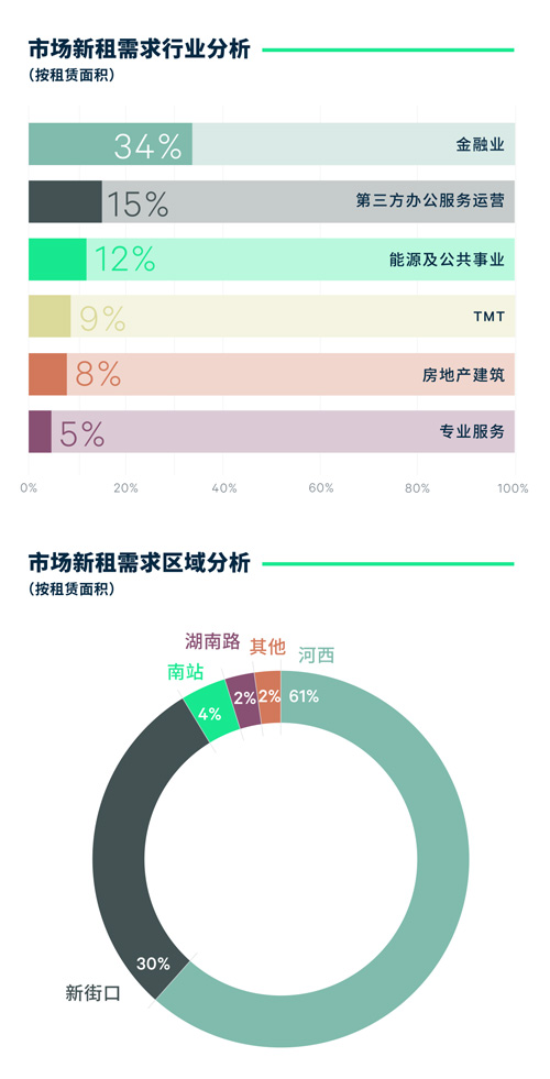 需求方面,金融業(yè)以銀行及保險機構(gòu)為引領(lǐng)釋放穩(wěn)定租賃需求。河西板塊金融能級不斷提升,廣泛吸納銀行、保險及證券公司等大面積搬遷需求,而基金與普惠金融類新興業(yè)態(tài)呈現(xiàn)多板塊分布態(tài)勢,在新街口、南站、湖南路等區(qū)域亦錄得成交。市場修復(fù)加劇需求動能更迭,第三方辦公服務(wù)運營商積極擴張,躍居第二。本土商業(yè)空間運營品牌緊抓核心板塊租金窗口期鎖定成本優(yōu)勢,連續(xù)兩個季度錄得新設(shè)點位。此外,新能源及環(huán)保相關(guān)產(chǎn)業(yè)競爭力增強,驅(qū)動能源及公共事業(yè)類企業(yè)升級需求保持堅挺;電商與平臺互聯(lián)網(wǎng)公司為首的科技企業(yè)租賃需求于河西及南站等板塊持續(xù)放量。