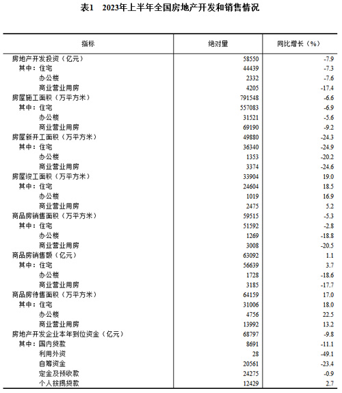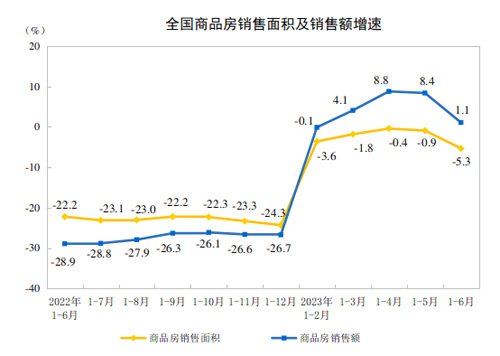 上半年,商品房銷售面積59515萬平方米,同比下降5.3%,其中住宅銷售面積下降2.8%。商品房銷售額63092億元,增長1.1%,其中住宅銷售額增長3.7%。