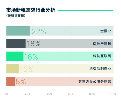 上半年新增租賃中,中資企業占比超過80%,繼續呈現強勁的增長勢能。外資企業占比較去年同期相比略有上升,主要來自金融和聯合辦公行業的新增租賃需求。