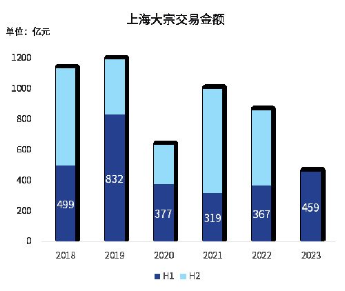 截至2023年6月30日,上海錄得大宗交易49宗,總金額近459億元,是2022年同期成交量的125%。