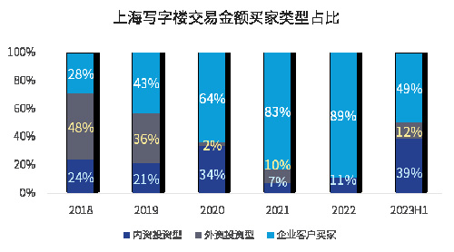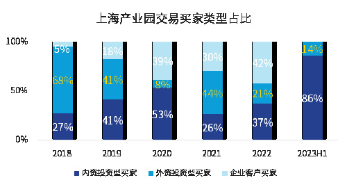 內資投資型買家完成的交易金額占比從2021年以來逐年遞增,上半年內資投資者占比達到86%,未錄得由企業(yè)買家完成的產業(yè)園交易。