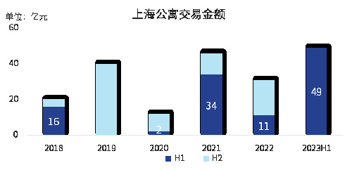 公寓的大宗交易從2021以來備受投資人矚目,基于交易金額分析,公寓市場熱度近期保持較高的態(tài)勢;2023年上半年公寓交易金額約為49億元,約為2022全年公寓交易額的158%。