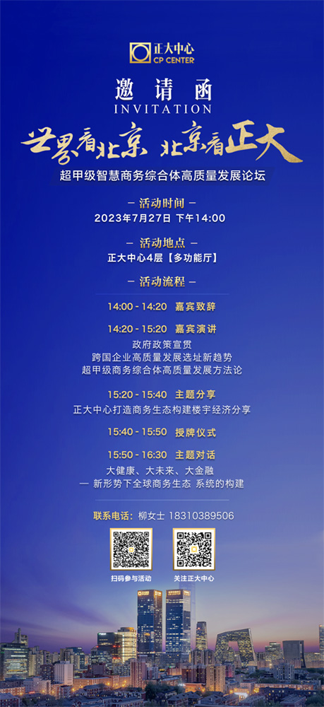 7月27日,世界看北京,北京看正大!誠邀業界嘉賓,共同譜寫超甲級智慧商務綜合體高質量發展的未來華章。