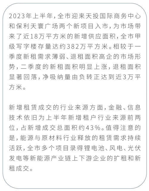 上半年成都寫字樓市場需求穩(wěn)步復(fù)蘇,退租面積環(huán)比顯著回落,凈吸納量由負(fù)轉(zhuǎn)正,得益于成都在新能源龍頭企業(yè)和中小企業(yè)集聚度上的顯著提升,能源類企業(yè)成需求增長新亮點(diǎn)。成都零售市場活躍度較去年同期有所回升,天府新區(qū)商業(yè)加速發(fā)展;天府和悅廣場以高入駐率開業(yè),開業(yè)期間優(yōu)異的人流量和銷售業(yè)績增強(qiáng)了市場對天府新區(qū)商業(yè)發(fā)展的信心。物流市場供應(yīng)量回落,降本增效成主流,市場需求回歸理性。