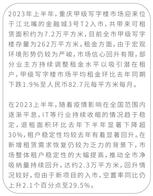 新項目入市不斷豐富零售市場品牌矩陣,其中萬象城北區的入市帶來眾多城市首店。以戴家巷、民主村等為代表的城市更新項目的市場關注度也在持續提高,或將為重慶零售市場存量項目業態結構的優化以及消費場景的打造提供新的思路。甲級寫字樓與高標倉物業整體租賃需求較往年平均水平仍有差距,但凈吸納量較去年同期均回升明顯,市場整體需求或將在未來保持緩慢回升之勢。