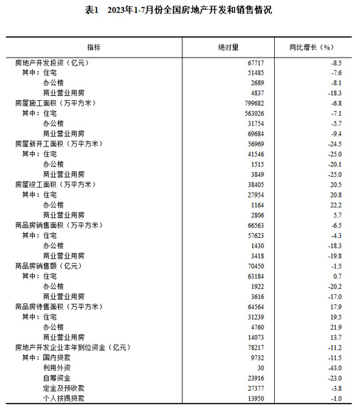 國家統計局:2023年1—7月份全國房地產市場基本情況