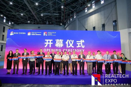 在8月3日BAU CHINA及RealTech開幕式上,全聯房地產商會會長、大漢控股集團有限公司董事長付勝龍,全聯房地產商會常務會長、北京天鴻控股(集團)有限公司董事長柴志坤,全聯房地產商會黨委常務副書記、秘書長趙正挺,全聯房地產商會副會長、精瑞不動產研究院院長張雪舟,新城控股集團副總裁管有冬,遠大住宅工業集團股份有限公司董事、副董事長唐芬,廣聯達科技股份有限公司副總裁郭建峰,北新建材黨委副書記、總經理管理,全聯房地產商會企業研究分會執行會長陳嘯天,慕尼黑展覽(上海)有限公司中國區總裁沙怡文等主辦單位及代表企業領導上臺剪彩并合影。