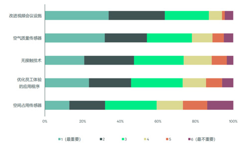 在世邦魏理仕發布的《2022中國辦公樓租戶調查》中提到,企業持續關注辦公環境的質量和舒適性,83%的企業愿意增加或者維持對辦公室科技的投資。其中,改進視頻會議設施、采用無接觸技術、優化員工體驗的應用程序等成為企業重點關注的需求。