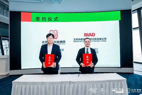 北京市建筑設(shè)計(jì)研究院副總建筑師、第七建筑設(shè)計(jì)院院長(zhǎng)及黨總支書記、未來院執(zhí)行院長(zhǎng)高博,北京豐臺(tái)文化旅游集團(tuán)有限公司副總經(jīng)理申瑾上臺(tái)簽約