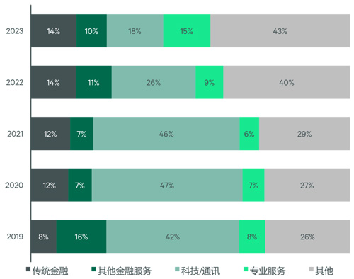 在金融創新政策的帶動下,其他金融服務的發展為深圳寫字樓市場需求貢獻較多。由于個人財富的增加,帶動資管需求水漲船高,從而推動來自以投資理財和財富管理為主的創新金融類企業如雨后春筍一般,在深圳這個金融行業開放的大環境下穩定增長。2021-2023年期間,該兩類企業為深圳優質寫字樓市場的金融板塊貢獻了30%的需求。