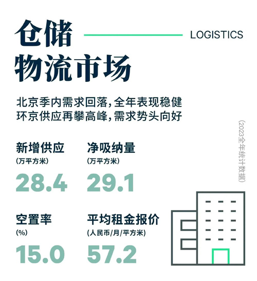 2023年第四季度,北京順義竣工一座倉儲物流項目,帶來12.2萬平方米的新增供應。至此全年新增供應28.4萬平方米,盡管較2022年減少,但顯著高于過去十年的平均水平。季內凈吸納量5.2萬平方米,綜合性第三方物流新租表現亮眼,占據總成交面積的56%;其次半導體、汽配、醫藥等制造業亦貢獻24%的新租,具有大面積可選空間的平谷及大興空港表現活躍。全年全市凈吸納量錄得29.1萬平方米,第三方物流需求占據全年主力,新租面積較去年提升16%,而由于疫情后消費部分回歸線下,電商新租面積同比縮減達25%。