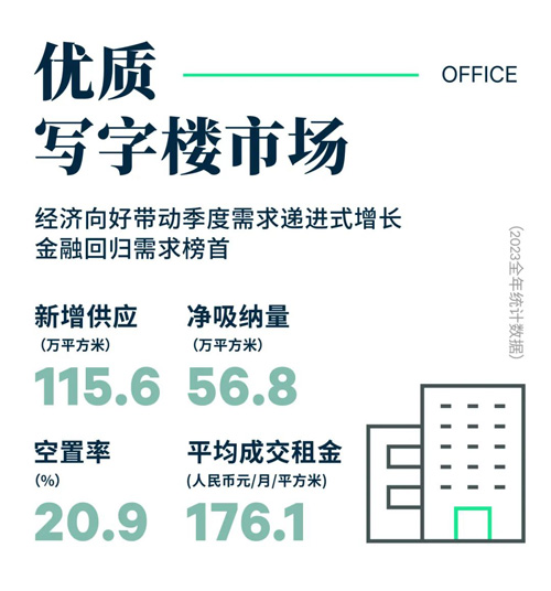 經濟回升向好帶動優質寫字樓市場需求逐季遞進式改善,第四季度以價換量帶動市場需求實現了進一步改善,當季共錄得18.0萬平方米的凈吸納量,同比及環比增長明顯,分別上漲76.3%和20.0%。全年凈吸納量共計56.8萬平方米,同比躍升44.8%,但與疫情前的年均水平相比仍有一定差距。受新增供應以及需求尚未完全修復影響,整體市場空置率同比上升2.1個百分點至20.9%,與疫情前的2019年趨同。