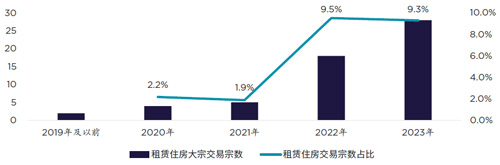 據不完全統計,截至2024年上半年,中國租賃住房項目大宗交易共計69項,大宗交易建筑面積超160萬平方米,整體交易額超過212億元,共涉及超3.5萬套租賃住房。租賃住房交易宗數從2021年及以前的不足5宗快速漲至2023年的28宗,2023年交易宗數同比增長55.6%,2024年1-6月租賃住房大宗交易宗數共計12宗。