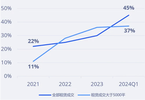 ▎新質生產力企業租賃成交數量占比,2021-2024Q1 數據來源:高力國際