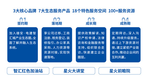 為滿足企業多樣化辦公需求,打造全新商務生態,雄安·電建智匯城推出了“智匯城星火BOX”服務體系。該體系以“政、產、商、學、研、文旅、配套”七大產業要素為支撐,聚焦“產業鏈、創新鏈、人才鏈、資金鏈、價值鏈、政策鏈”六鏈融合,形成了服務企業全生命周期的創新示范,為企業提供多層次、全方位的支持。