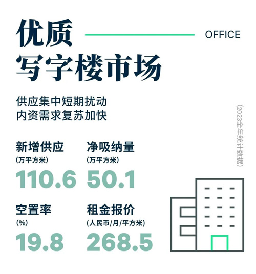 2023年上海寫字樓市場共錄得18個新增供應,共計110.6萬平方米,同比上升31.1%。從供應區域來看,主要布局在北外灘、前灘、真如和花木子市場。新增供應集中入市,推動全市空置率攀升至19.8%,同比上升2.4個百分點。